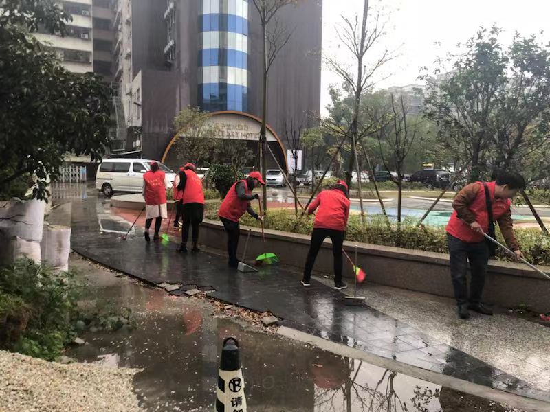 3月5日下午,天下著毛毛雨,志愿者們身著紅馬甲,拿著掃把、靶子等工具,對停車場、小公園地面的落葉、雜物進行全面清掃,對一些死角進行清除。志愿者們不怕冷,不怕累,經(jīng)過長達2個小時的努力,把小公園及停車場打掃得干干凈凈。